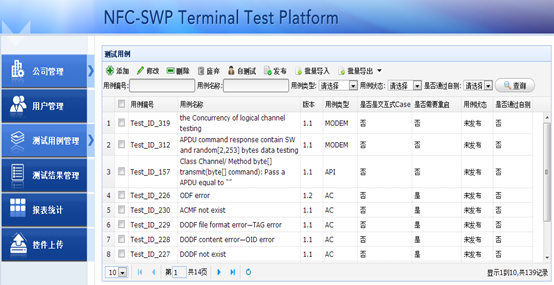 NFC-SWP---SIM卡自動化測試管理系統(tǒng)項目為手機制造廠商提供自動化測試功能,支持用戶對測試場景的配置、測試用例的自動化測試及對測試結(jié)果進行實時查詢,系統(tǒng)源數(shù)據(jù)來源于測試用例與腳本的導入。